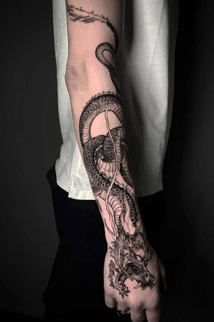 - Los tatuajes con dragones tienen un doble significado, ya que en la mitología oriental estas criaturas personifican la fuerza y sabiduría. Por otro lado, todo aquel que lleva tal símbolo acepta el hecho de la existencia de la guerra, una batalla que hay que ganar.