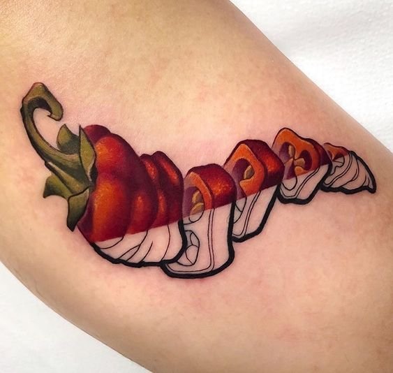 - Tatuajes a color. Un pimiento colorido con transiciones de rojo a naranja creará un efecto de volumen y atraerá la atención a tu tatuaje.