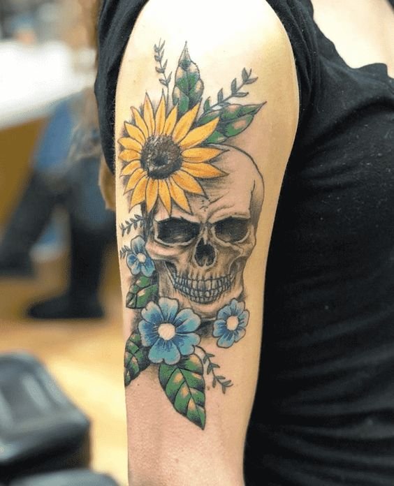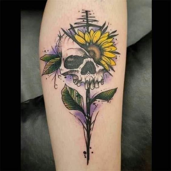 - Un cráneo colocado en el centro del girasol simboliza la vida y la muerte, el florecimiento y la decadencia, la fuerza y la debilidad. Este tema original es adecuado para personas creativas que buscan soluciones no convencionales.