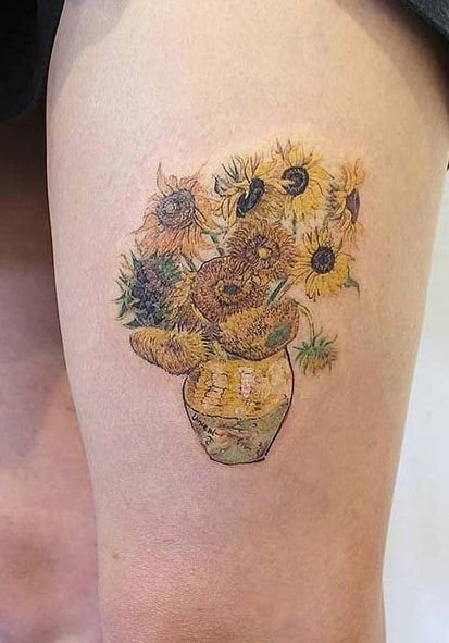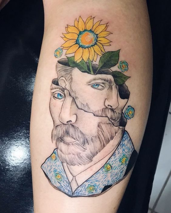 El diseño al estilo de Van Gogh es un tema aparte. El genial artista neerlandés sentía una pasión especial por las flores amarillas, dedicando dos series de pinturas a los girasoles. Las obras de Van Gogh son una fuente inagotable de inspiración al elegir el diseño de un tatuaje.