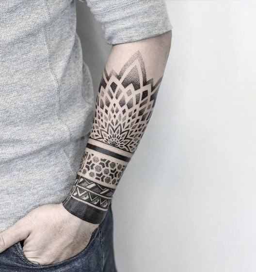 - Mandala de la Suerte: combina formas geométricas como rombos, triángulos y círculos. En general, el diseño se asemeja a un cristal multifacético. Este tatuaje ayuda a alcanzar los deseos y acerca el éxito en los asuntos.