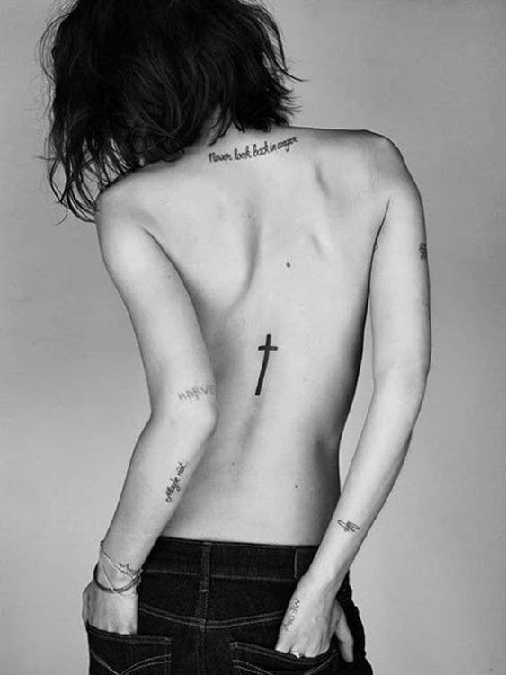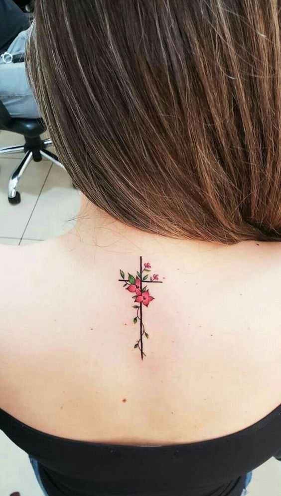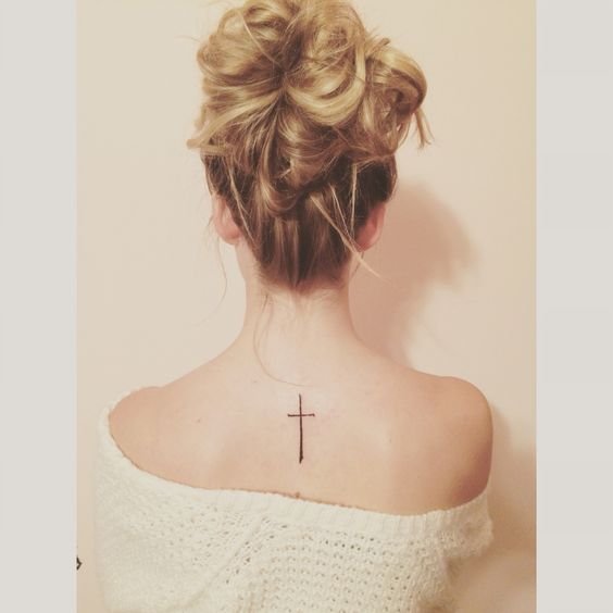 - En el cuello, detrás de la oreja, entre los omóplatos: en estos lugares, es apropiado aplicar un diseño de cruz en un estilo minimalista. Líneas nítidas, tamaño pequeño, monotonía: todo esto se ve ordenado y con buen gusto.