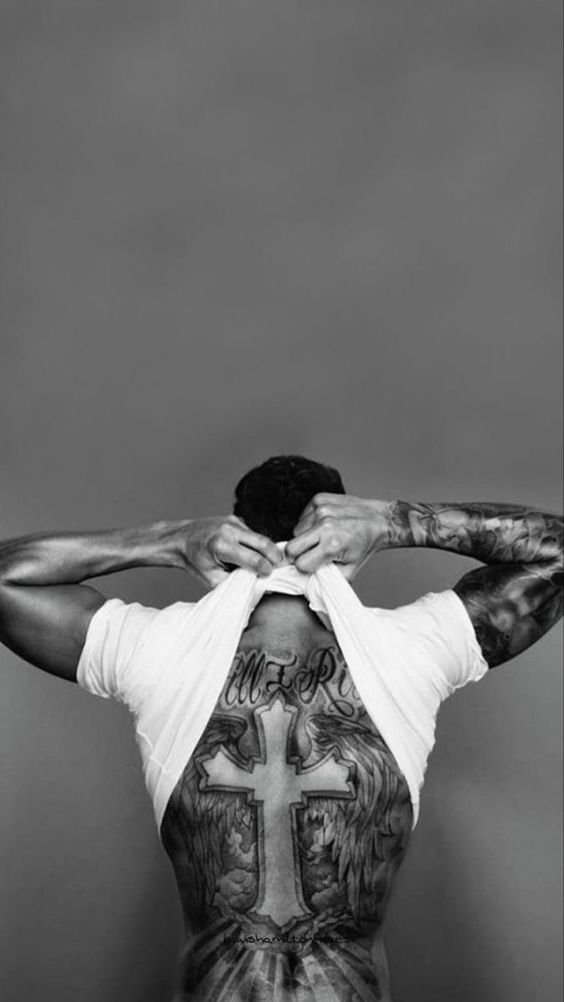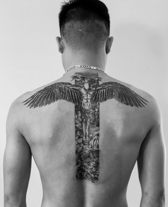 - En la espalda: aquí se realizan auténticas obras de arte, verdaderas composiciones, ya que hay suficiente espacio. La crucifixión de Jesús es una opción clásica que muestra una profunda fe y la búsqueda de un propósito personal. También son populares los diseños con alas, figuras humanas y adornos.