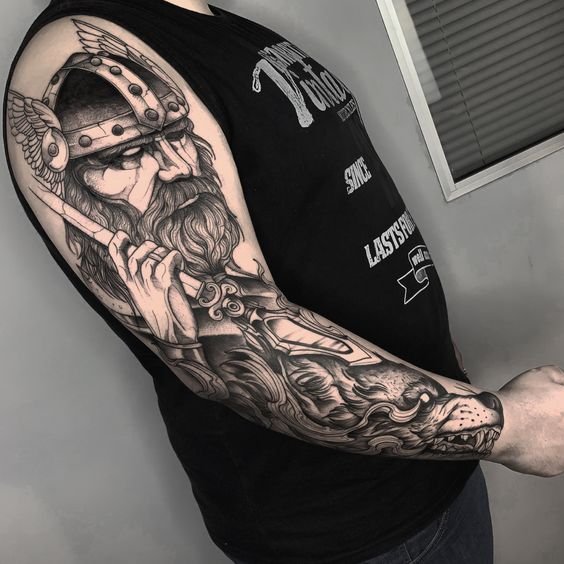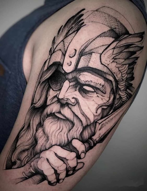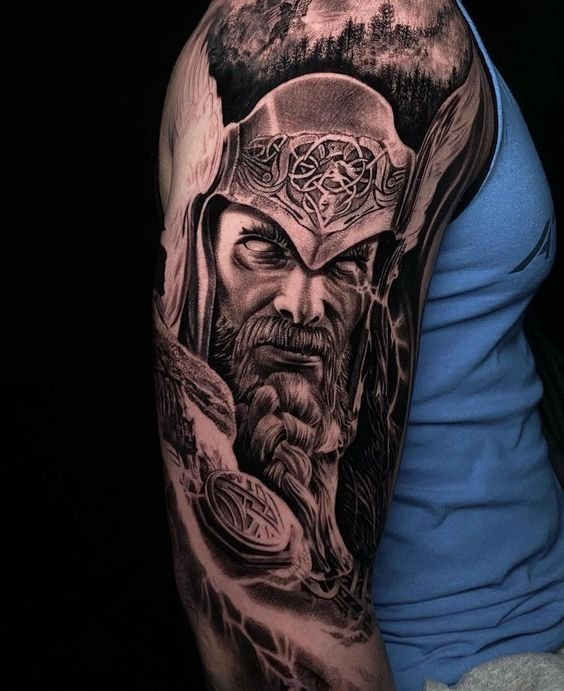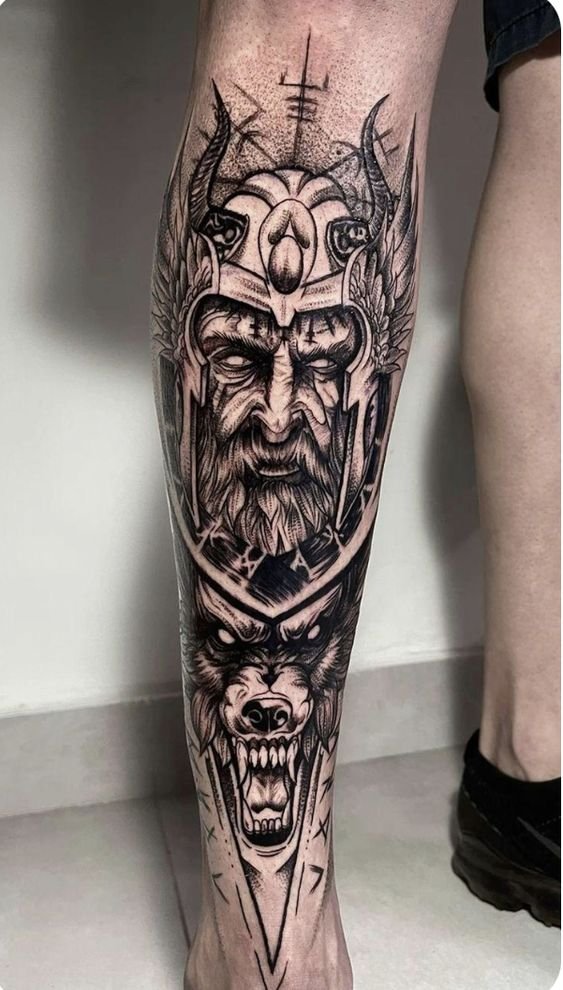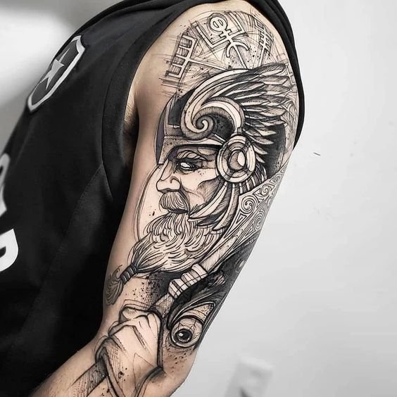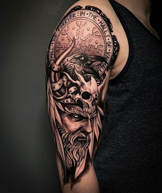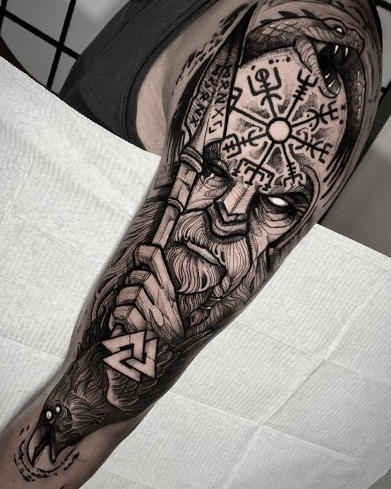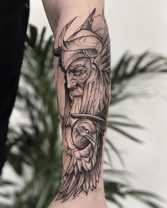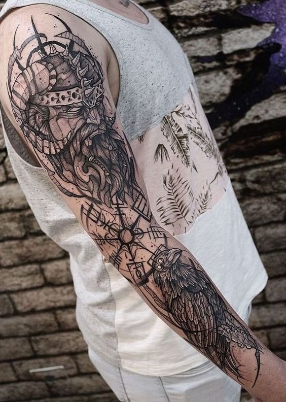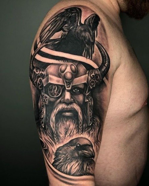 - Los cuervos Huginn y Muninn. Los sirvientes alados de Odín que volaban por el mundo recolectando información para él. Se cree que el tatuaje de los cuervos mejora la memoria y otorga sabiduría.