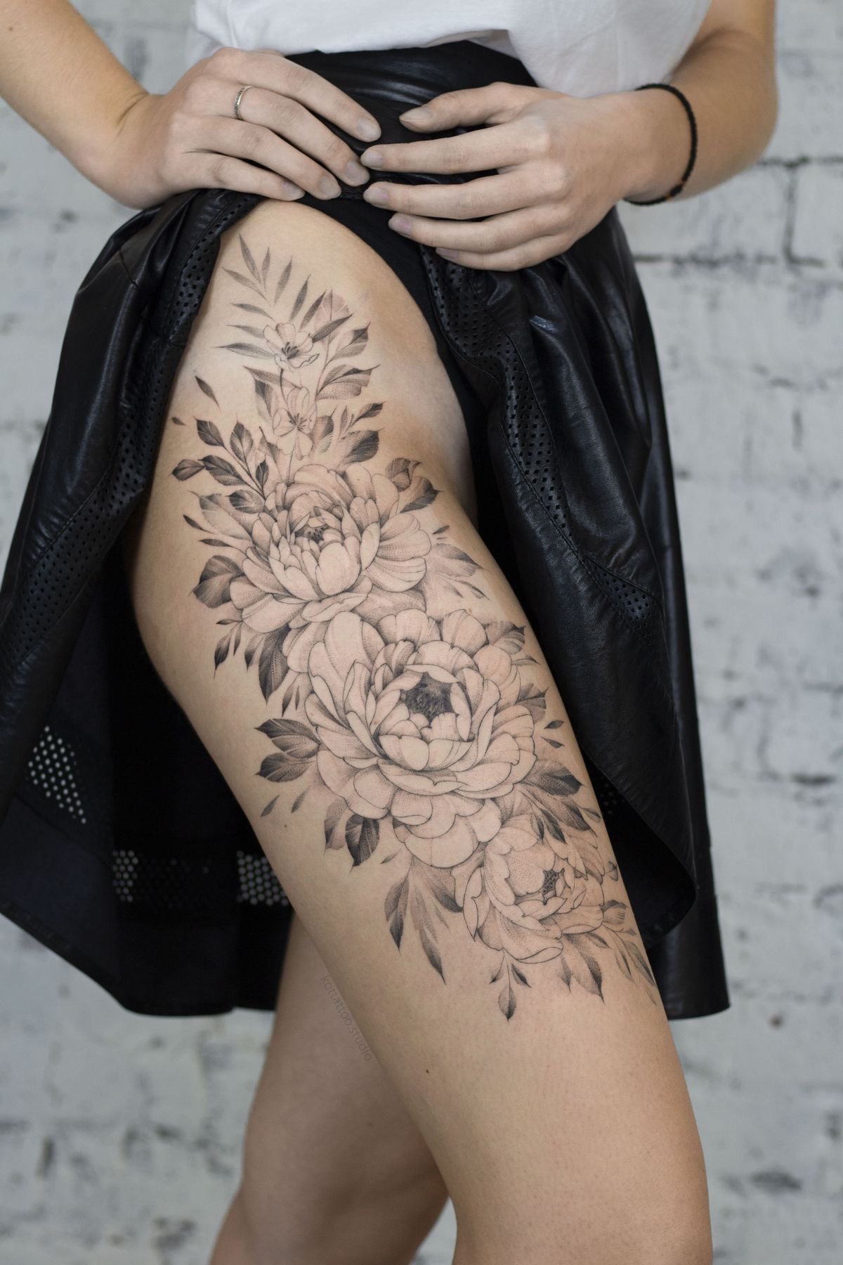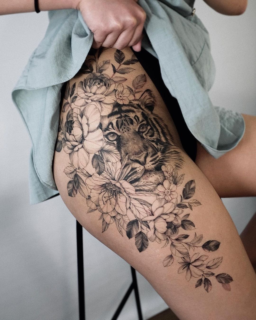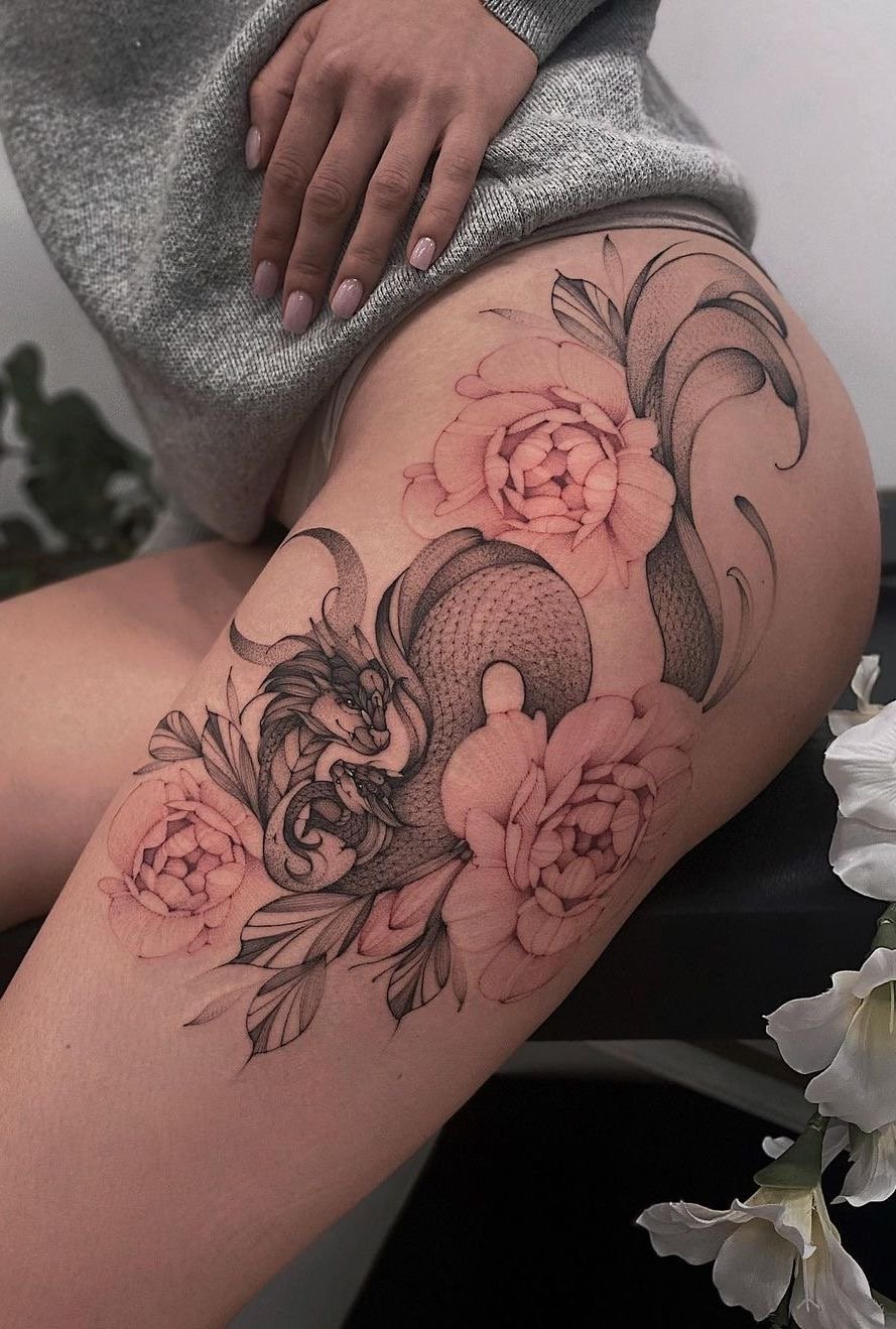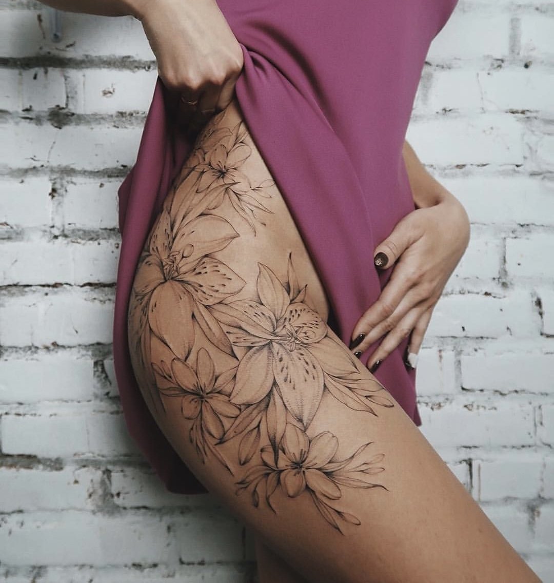 Si aún no has considerado un tatuaje en los muslos, ¿quizás es el momento adecuado? Esta área permite dar vida a diseños de cualquier complejidad y escala. Independientemente del estilo y la técnica utilizada, un dibujo en el cuerpo puede convertirse en una verdadera obra de arte con la participación de un maestro experimentado y un enfoque responsable por parte de la propietaria del tatuaje. El body art en los muslos siempre es una excelente elección.