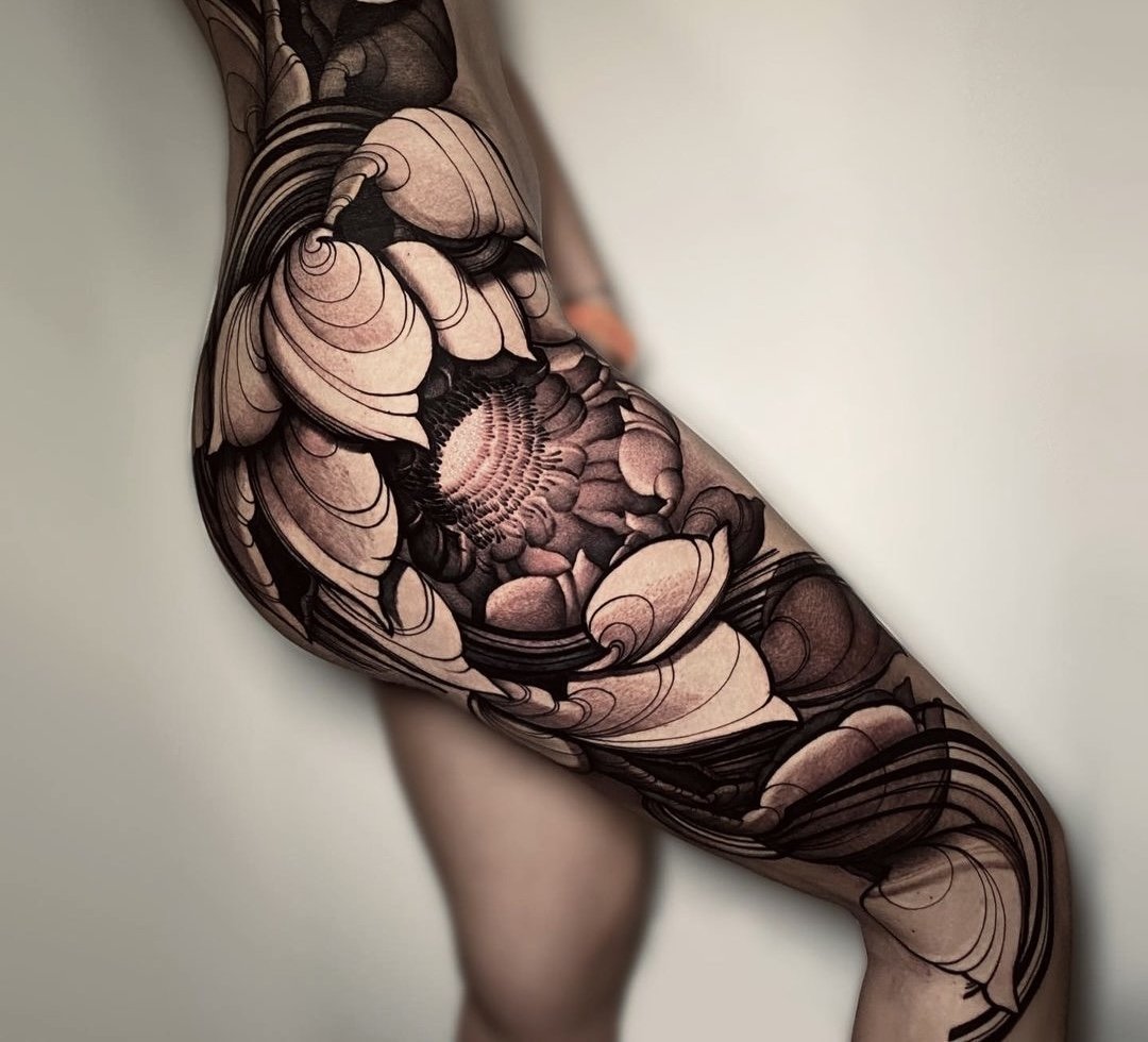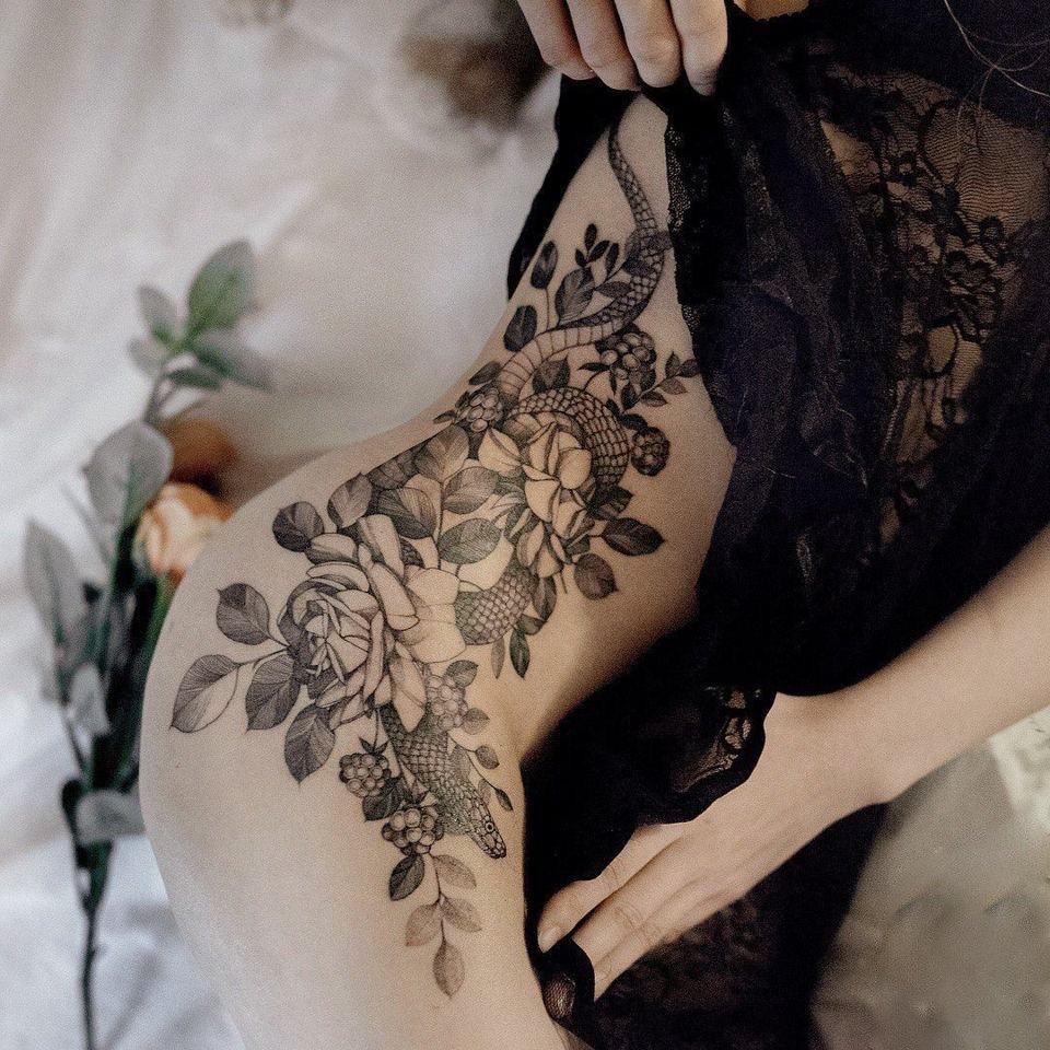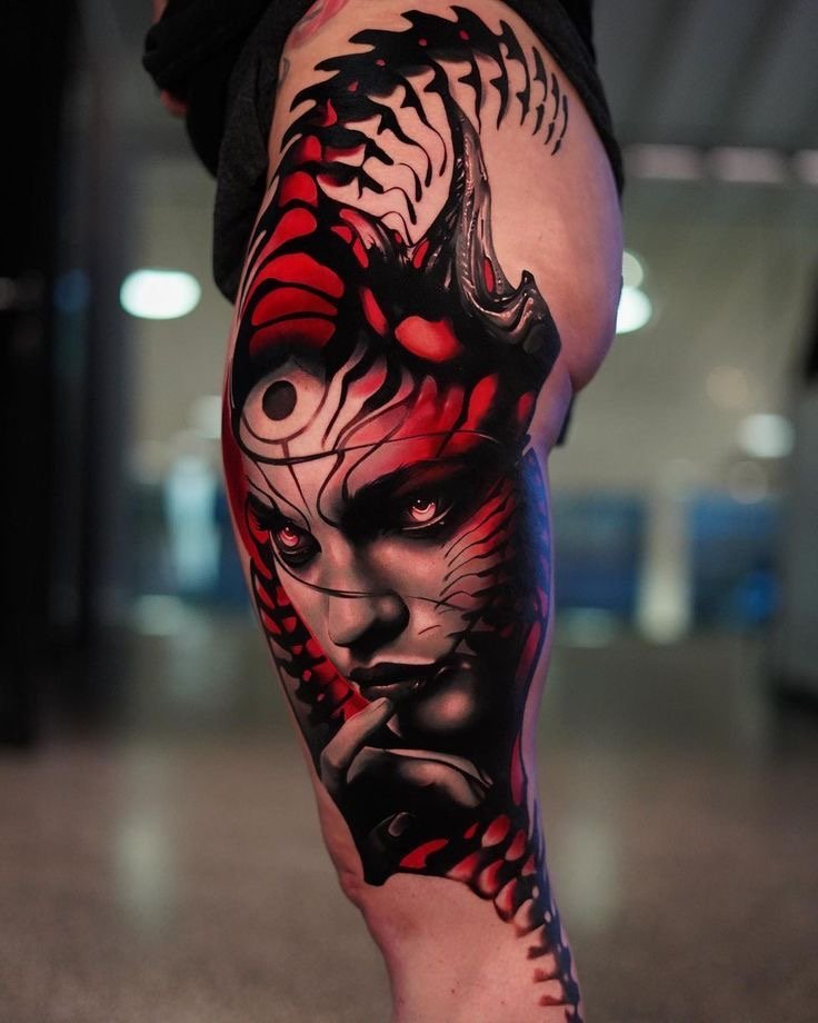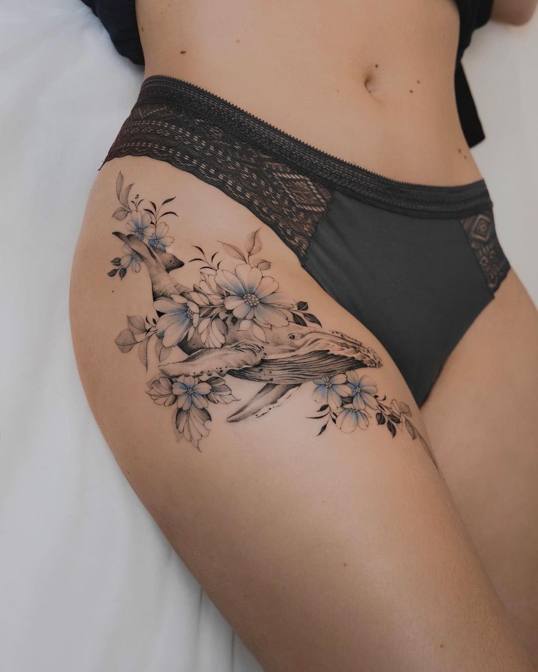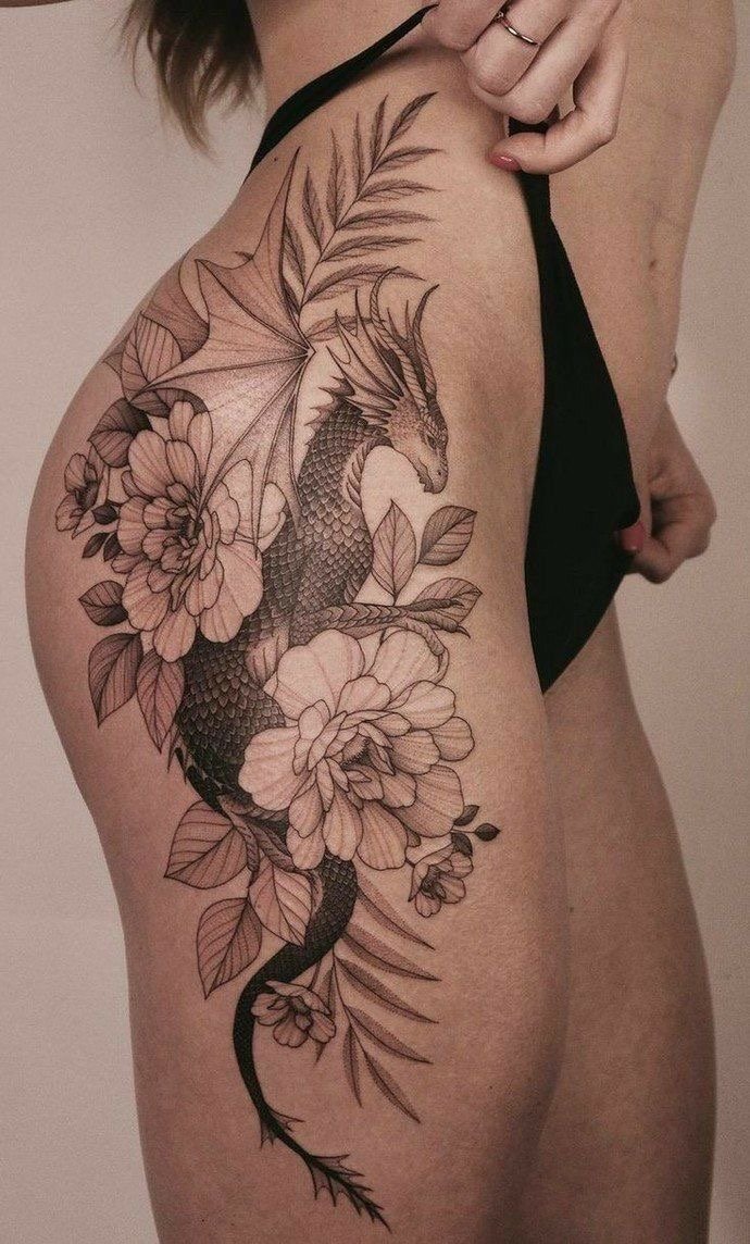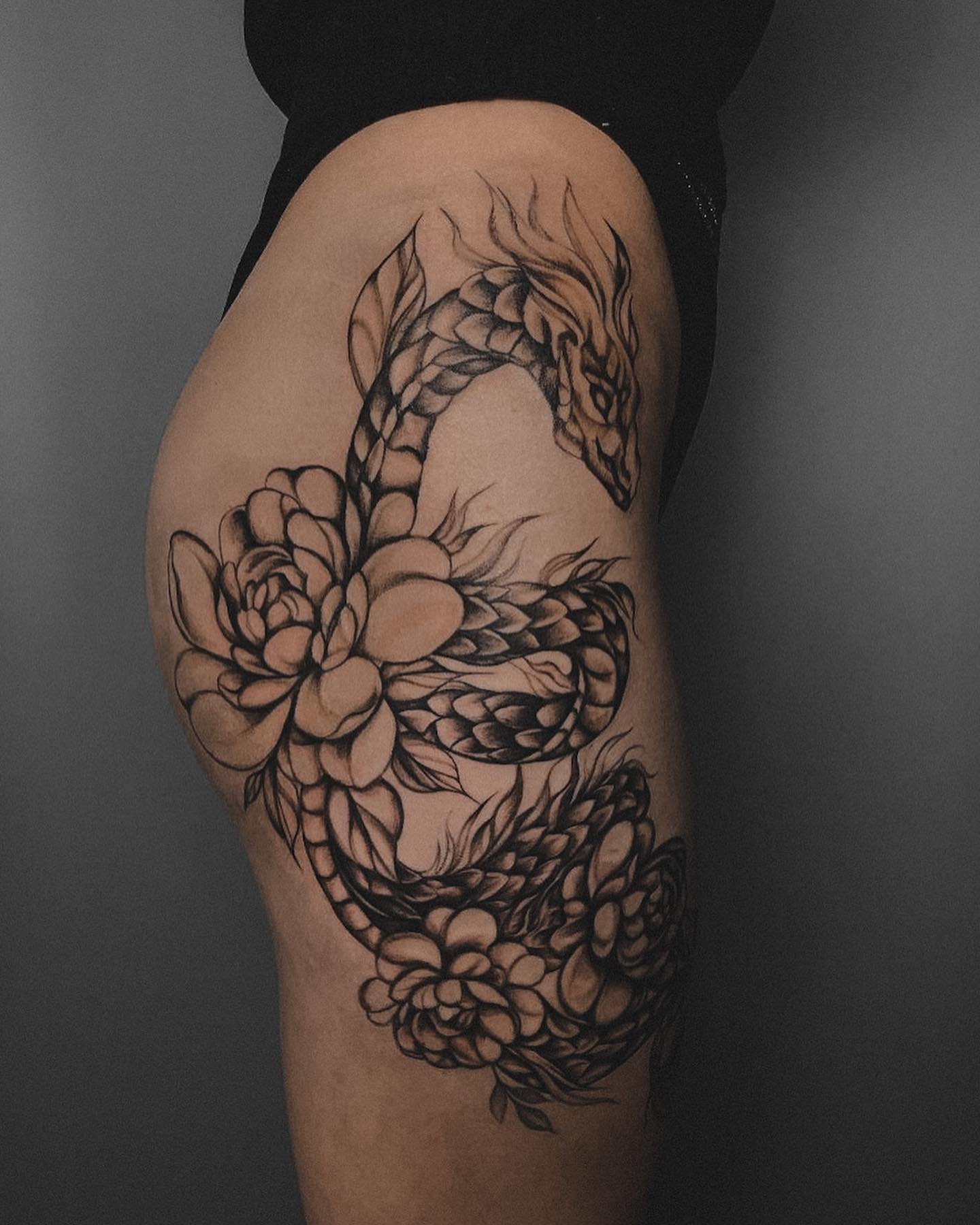 Si aún no has considerado un tatuaje en los muslos, ¿quizás es el momento adecuado? Esta área permite dar vida a diseños de cualquier complejidad y escala. Independientemente del estilo y la técnica utilizada, un dibujo en el cuerpo puede convertirse en una verdadera obra de arte con la participación de un maestro experimentado y un enfoque responsable por parte de la propietaria del tatuaje. El body art en los muslos siempre es una excelente elección.