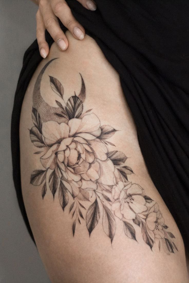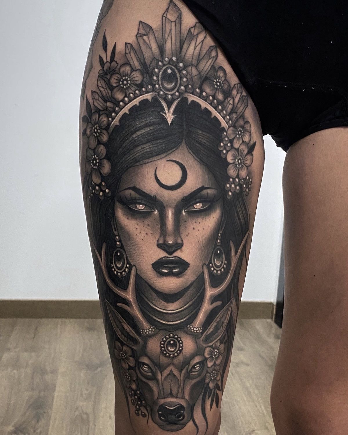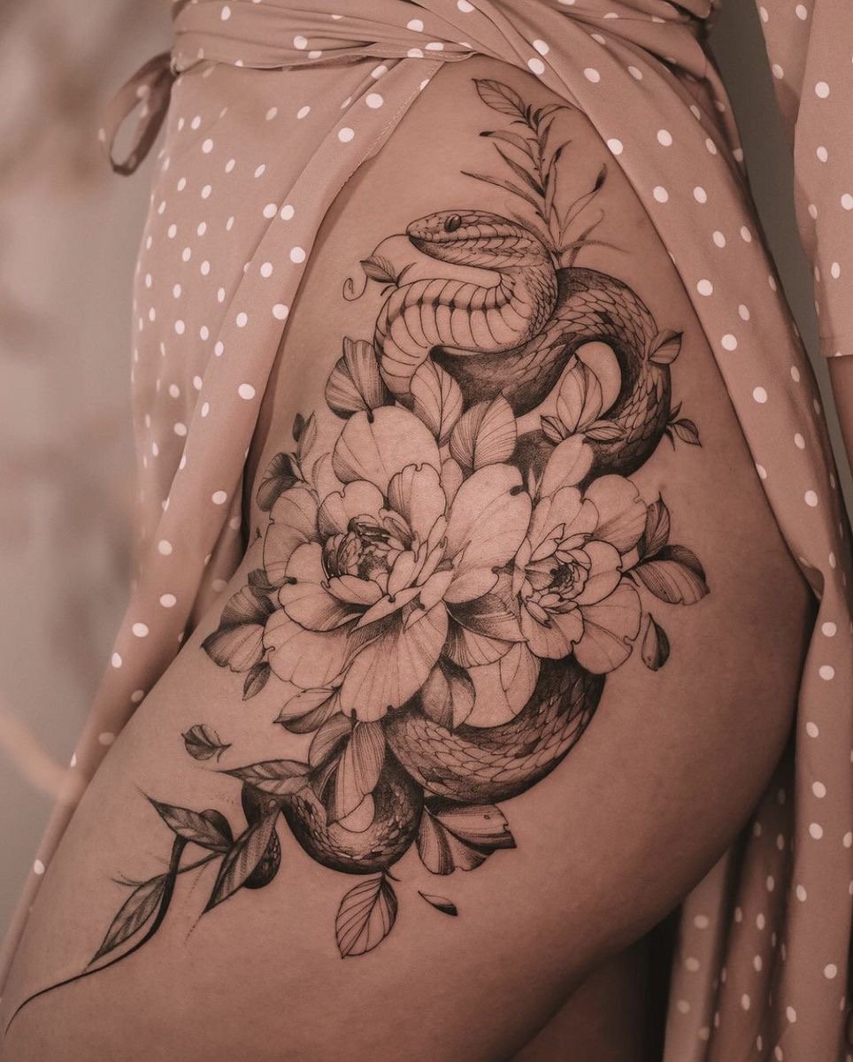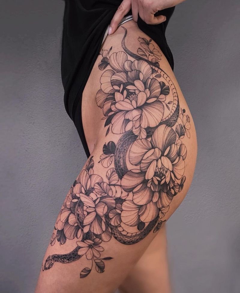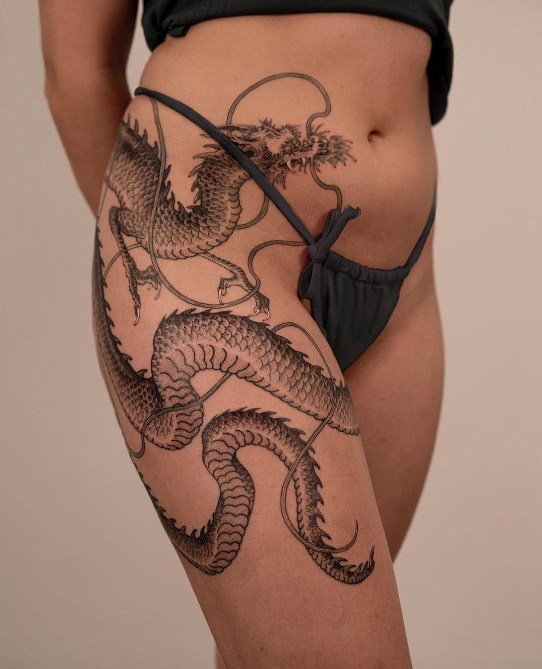 Si aún no has considerado un tatuaje en los muslos, ¿quizás es el momento adecuado? Esta área permite dar vida a diseños de cualquier complejidad y escala. Independientemente del estilo y la técnica utilizada, un dibujo en el cuerpo puede convertirse en una verdadera obra de arte con la participación de un maestro experimentado y un enfoque responsable por parte de la propietaria del tatuaje. El body art en los muslos siempre es una excelente elección.