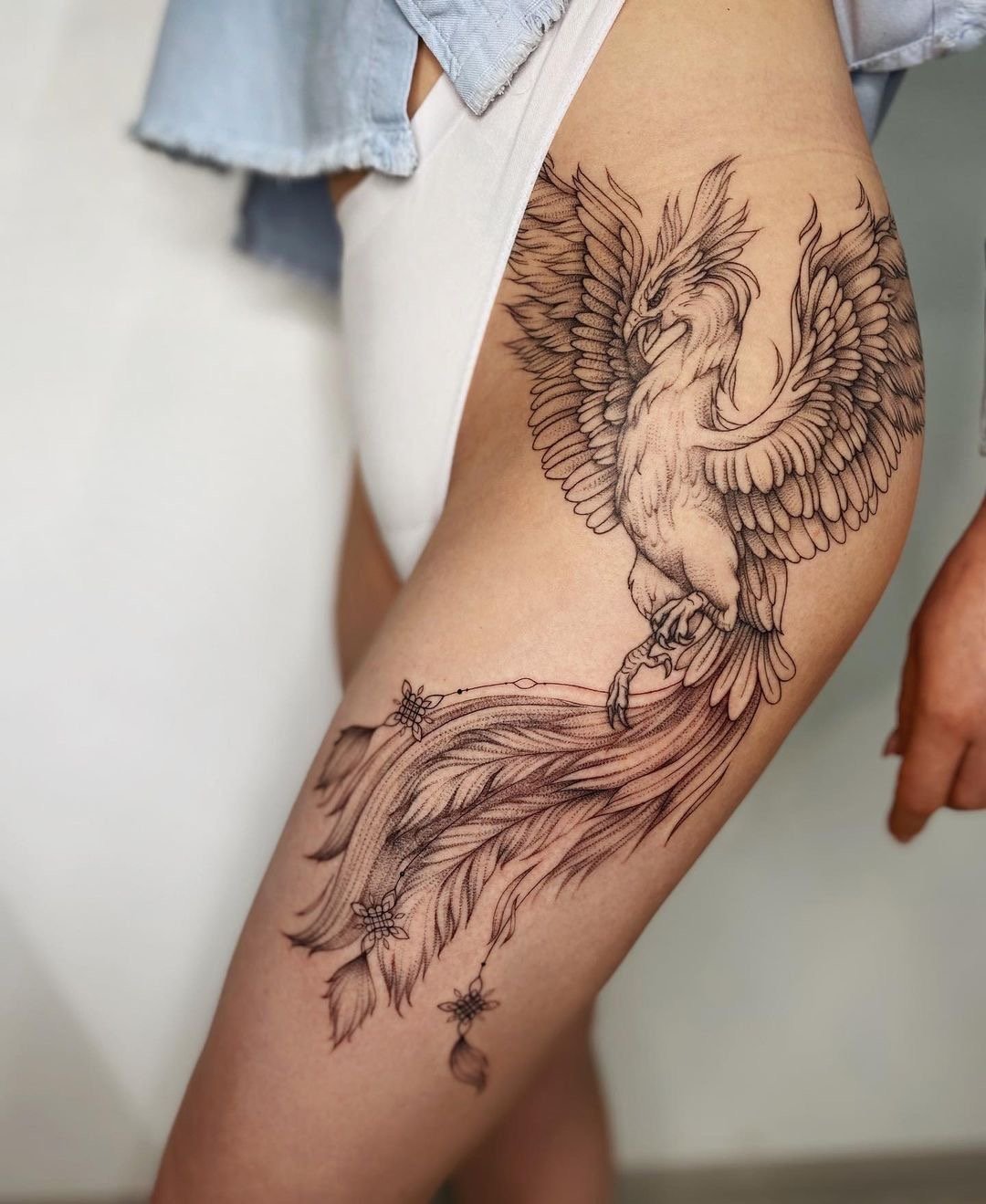 - Entre las ideas populares de tatuajes femeninos, el fénix goza de gran popularidad. Esta famosa criatura mítica tiene la capacidad de renacer de las cenizas, y su representación en el cuerpo simboliza la fuerza y un nuevo período de vida. Un fénix realizado en colores brillantes de naranja y rojo ardiente lucirá maravillosamente en el muslo.
