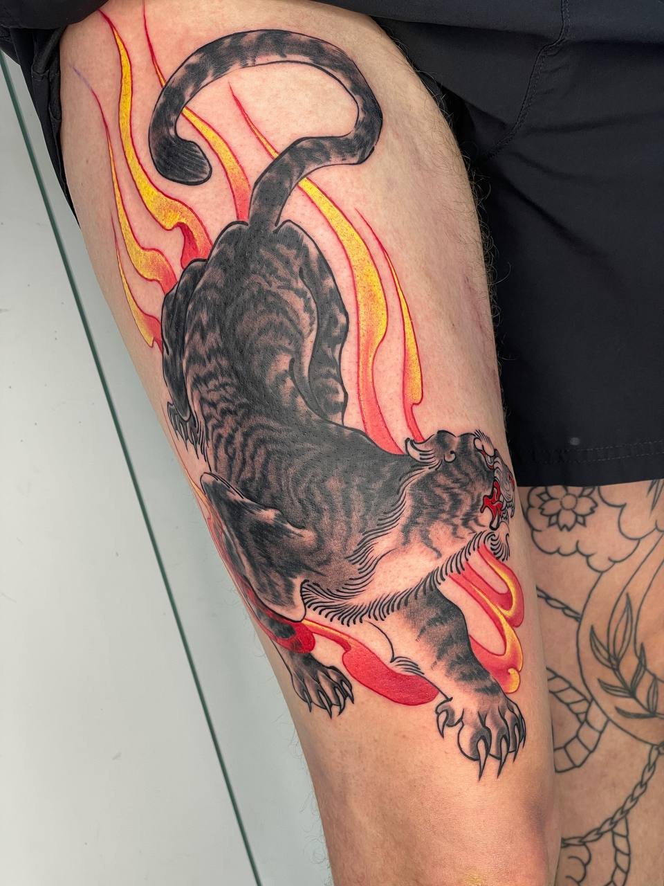 - El muslo proporciona un amplio y relativamente plano espacio para el artista. Es el lugar ideal para composiciones complejas, detalladas y de gran escala.